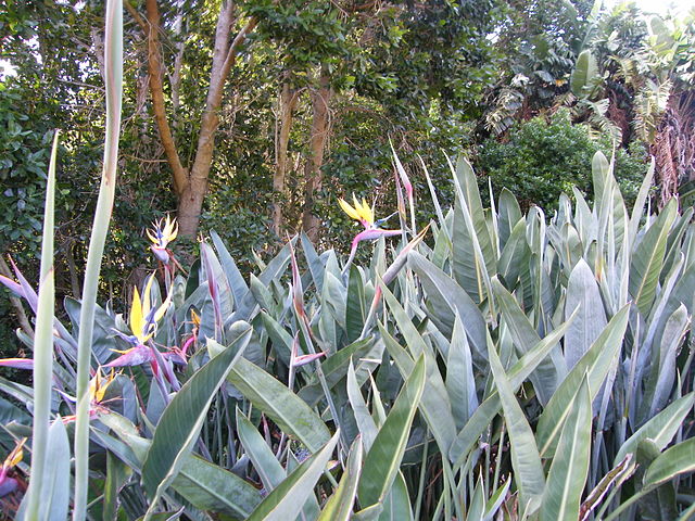 Strelitzia reginae is an evergreen clump forming perennial. It can reach a maximum height of 120 cm. Its large, bold dark gray-green leaves contrast nicely with its unusual crested flowers. The hard, beak-like sheath from which the flower emerges, is called the spathe, and has orange and blue petals. It flowers periodically throughout the year. The flowers are also used as cut flowers. The plant does well in full sun to semi-shade, and loves a rich loamy soil and plenty of water throughout the year, however it will tolerate drought very well. The plants are also wind resistant and grow well in coastal gardens.