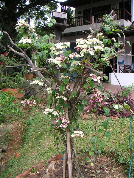 A twining shruby climer or vine. Leaves are ovate, glossy and deep green. Flowers are showy with white calyx and red corolla. The fruit is drupe. Very attractive vine which in warm location persist all year around. It needs support to trail on